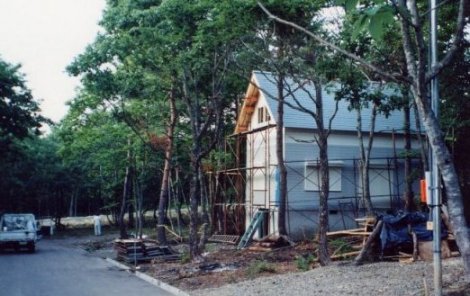 | 子供が最初見て「鉛筆の家」幅が無く尖がった家になってしまいました 足場も片付いていない上に、家の周りは火山灰土の黒くて細かい湿めった黒い土に悩まされました。 例えば、黒い土が手につくと指の爪、指紋まで黒くなって、靴に付くと黒い泥が中々とれない、滑りやすい、など 自然を残したいと思って回りの木を残したのが後になって、家が出来てしまってから雪、増築のため伐採しなければならなくなり大変な思いをしました。 家を建てる前に、家の周り2〜3m以内の木は思い切って伐採したほうが良いと反省しています。 |