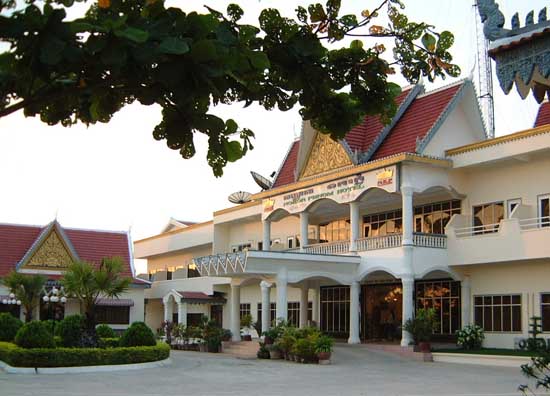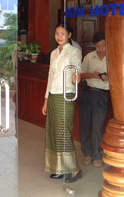 また、民俗衣装を身に付けた可愛い女の子に出迎えられ、雰囲気は満点。異国へ来たんだと言う実感が湧いてきました。ドアーサイドには、いつも写真の女の子が立っていて、私たちが出掛ける時や帰って来た時にしてくれる微笑ながら頭を少し下げ両手を合わせる合掌の挨拶はいやが上にも私たちの旅情をかき立ててくれるものでした。 滞在中、何度もこの幹線道路を通りましたが、シェムリアップには大都会で見るような高層ホテルは無く、全てが私たちが泊まったホテルと同じようにカンボジア風の屋根で、高いものでも4階建、殆どが2階建でした。ホテル以外の建物は全て2階建でした。 しかし、所変れば品変るではありませんが、一流ホテルと言えど、私たちの生活習慣とは相容れない面がどうしても出てきます。どのホテルもまだ新しく、観光客が大量に来始めたのも内戦が落ち着いた最近のことでしょうし、外国人馴れがしていないのかも知れません。 先ずは風呂をと言う事にしましたが、なかなか熱いお湯が出てきません。このことは、前もってガイドから聞かされていましたのでさほど気には止めませんでしたが、いざ風呂から出て水を抜こうと思ったところ、廃水栓につまみが付いていないではありませんか。ゴムの栓が配水管の中の方に確りと食い込んでしまいどうしても抜けません。持参していたサーバーイブツールを使ってやっと廃水に成功。日本人のようにどっぷり湯に浸かる習慣の無いこの国の人にとっては湯船の栓をすることなどまず無いのかも知れません。宿泊客の60%が日本人と言うこのホテル、今まで苦情が無かったのだろうかと不思議な気がしました。 次ぎに、床に付く前に窓の錠を確認したところうまくかえません。かえたと思って窓をがたがたと動かしてみるとはずってしまいます。何度も試しても駄目。私の部屋は1階、窓の外は庭になっていて、窓をまたいで簡単に部屋に入って来ることが出来ます。無用心この上も無い有様。 四苦八苦している時、偶然窓の外を通りかかったホテルの従業員が居たので呼び止め、状況を説明したところ 彼は、窓を跨いでひょいと部屋の中に入ってきました。 錠をがちゃがちゃいじっていましたが、 「OK.No problem.」 と言う。 私が窓をがたがたと揺するとまたはずってしまう。 「そんな風に揺すっては駄目。」 と彼は言う。 そんな馬鹿な、揺すってはずれるような錠で No problem のはずがない。 駄目なら部屋を換えてくれと強行に抗議すると修理担当の従業員が来て直して行った。 後のなって推測するに、この国(私が旅行中に見た範囲)では、最近建てられたと思われる洋風の建物は別として、民家の入り口にドアーのある家が少ない。部屋の中は丸見え。施錠に関する感覚が私たちと全く違うようです。 そう言えば、ホテルでは金銭を抜かれたり物を取られたりと言うこそ泥的な被害警告はあっても、強盗に進入され凶器を突きつけらて金を取られたとか、傷害事件が起きたとかの旅行情報は無かったような気がします。 施錠に関する感覚が私たちと全く違うような気がし、大使館情報ではセーフティボックスは必ずしも安全ではないとのことでしたが、取られるよりましと早速大事なものはホテルのセーフティボックスに預ることにしました。