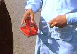 切符切りたちは、入って来る車に近付いては切符を切っていましたが、切符を切る手に持っている物がどうも日頃私たちが見慣れている切符切鋏とは違うようで、何か違う道具で入場券に印を付けているのだと思っていました。 しかし、私たちの切符を切りに来た時に、手に持っていた物を見て、 「なーるほど」 と感心してしまいました。 それは、私たちが書類をフアイルするために穴を開ける時に使う事務用の穴あけパンチでした。これを使って入場券の角に穴を一つ開けてくれます。 この日は、面白い使い方を考えるものだと感心して終わりましたが、後になって考えると、何のために入場券に穴を開けるのかが分かりません。入場券には有効日数と有効期限が書いてあり、その間は何度でも出入りできるようになっています。そして、切符もトールゲートを通る度に切るわけではなく、有効期限の経過日数分だけ穴が開けられていました。有効期限や日数は入場券に書いてあるのですからわざわざ切符切りをするのには何か意味があると思いますが、いくら考えても分かりません。
