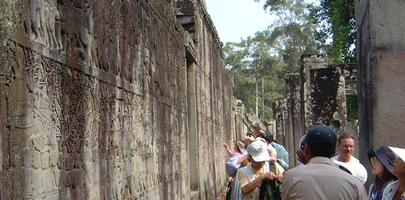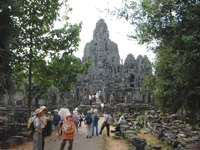 王宮の正門は、勝利の門とも呼ばれ、一段高くなった象のテラス及びライ王のテラスと呼ばれる謁見台につながっています。このテラスの前には広場があり、テラスの上から閲兵する王族達の前を戦地から凱旋してきた兵士達が行進し勝利の門を通って入城したということです。 私たちがテレビでよく目にする、中国の天安門前広場や旧ソ連の赤の広場と言ったところでしょうか。 また、この広場では、町の人々を集めて王の謁見式や、王国の全土から神仏像が集められ、王臨席の下で清める儀式も毎年行われたそうです。 バイヨン寺院回廊のレリーフ(後述)を見た後で、このテラスに立つと、行進する軍隊の様子やこの広場で繰り広げられた様々な行事の様子が瞼に浮かび、往時の様子を偲ばせてくれます。 クメール建築では、神の為の宮殿は耐久性のある砂岩やレンガで、人間である王の宮殿は自然の恵みを象徴する木造というように材料を使い分けていたということで、アンクルトムの王宮跡も屋根瓦や陶器の破片が散在しているのみで建築物の遺跡は全く残っていません。 アンコ−ルトムの中心に位置するのがバイヨン寺院で、観世音菩薩の四面仏塔が乱立するこのバイヨン寺院はアンコールワットと共にクメール建築美術を語る上で欠くことのできない二大遺跡といわれています。 大乗仏教に深く帰依していたジャヴアルマン7世の時代に建造されたバイヨン寺院は、メール山(弥勒山)を象徴化していて、古代インドの宇宙観によると神々の住む霊域で、また神が降臨する場所でもありました。東西南北に伸びる幹線道路は、弥勒山から世界に向かう道を象徴し、城域はヒマラヤの霊峰を、城壁を取り巻く環濠は大海を表したものだそうです。 二重の回廊の中に伽藍があり、中に入ると光が殆ど差し込まない地下の迷路のようで、神秘的な雰囲気をかもし出していますが、壁面に彫られた彫刻を眺めながら徘徊するのも一興かも知れません。 伽藍の外側には四方から階段があり上のテラスまで上ることができますが、階段は急で、上に上がって下を見ると、まさに崖の上に立っているような感じでした。上りはまだしも、下りはたいへん危険なので南側階段に金属パイプの手摺が取り付けてありました。