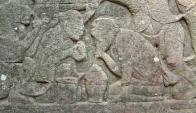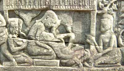 漁の有様、狩の有様、炊事の様子、闘鶏場面、将棋指す人、相撲の様子、酒を酌み交わし話しにふける人、出産の様子など当時の日常的な庶民や貴族のありとあらゆる生活の様子のみならず、戦場での光景なども詳細に描かれていて見飽きる事がありません。 戦場場面では、着ている服装や髪型などから、どこの国と戦ったのか、同盟国はどこだったのかなど戦に加わった人たちの国が分かり、武器などから当時の戦の様子を知ることもできます。 また、戦場の後方では女性や子供達が料理を作ったり運んだりしていて、家族ぐるみで戦場に移動していたことも分かります。 当時の人は、ユーモアの心も忘れてはいませんでした。寺院のレリーフとも思えない滑稽な場面も多々出てきます。 軍列の後ろを行く食料運搬部隊の行列の中で、運ばれている亀が前を行く人の尻に噛みつき、噛みつかれた人が後を向いて怒っている様子、座り込んで盗み酒をしている人たち、虎に追われて必死になって木の上に逃げるバラモンの僧たち。思わず笑いが込み上げてきます。 建築場面では、石材を運び、加工し、積み上げる工事の様子が詳細に描写されていて、建築現場の様子を彷彿とさせてくれます。 この浮き彫りレリーフを一こま一こま見ていると、あまりにも現在の私たちの生活に似ていて苦笑するものもたくさんありました。人の生活などと言うものは千年の歳月を経てもさほど変るものではないなとつくづく思いました。