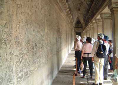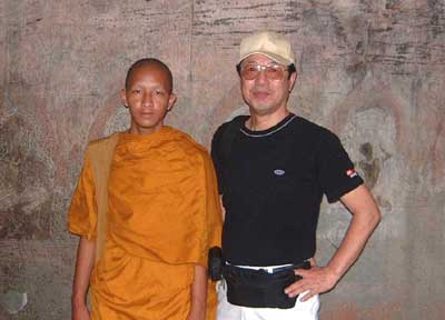 私が、アンコールワットを初めて目にした時の印象は、素晴らしいの一言でした。そのスケールの大きさには目を見張りました。幅数百メートルにも及ぶと思われる広い堀に囲まれた広大な敷地に建てられたアンコールワットのイメージは、写角の狭いカメラのレンズにはとても収まり切らず、ビデオカメラを持ってこなかったことを悔いた次第です。この景色を、私の感じたイメージの映像に収めようとすれば、ビデオカメラでの風景をなぞりながら撮影するより方法はないでしょう。 アンコールワットの第一回廊にも一大絵巻が描かれています。 西面南側にはインド古来の叙事詩「マハーバーラタ」、西面北側にはインドの叙事詩「ラーマーヤナ」、南面にはスールヤヴァルマン二世の行軍と死後の世界を表した「天国と地獄」、東面にはヒンズー教の天地創造神話「乳海攪拌」とヴィシュヌ神と阿修羅の戦い。 私にこうした古典神話についての知識があればもっと楽しくこれらの絵巻を楽しめたのにとつくづく思いました。 絵を見ていて 「あれっ、孫悟空がいる」 と思ったのは、ラーマ王子に率いられた猿軍の将ハヌマーンだそうです。 でも、孫悟空の発想も案外こんなところにあったのではと勝手にほくそえんでいました。 この壁画を見ている時、一人の僧侶が私たちの側を通りかかりましたが、私たちが通路を塞いでいて通れず立ち止まって待っていました。 この僧侶と一緒に記念撮影をと何時もの私の悪い癖が出てきました。 修行中の僧侶にどう対応していいのか分からない私は、ガイドに其の由を伝えてくれるようお願いしました。ガイドは、一言二言僧侶に向かって言っていましたが、僧侶はにこっと笑みを見せただけで何も言いません。 「いいのですか。」 と念を押すように私が言うと 「いいと言ってますよ。」 との返事。 ???です。 でも、ガイドがそう言うんだからいいのだろうと横に並んで写真を写させてもらいました。 「お布施を上げた方がいいのでしょうか。」 とガイドに聞くと、 「あげてもあげなくても。」 とガイド。 私は猛スピードでお布施の金額を頭の中で計算しました。いままで見てきたこの国の物価から判断すると・・・。ということで1米ドル紙幣をお坊さんに渡すとお坊さんは、にっこりと微笑んで合掌。 いい旅の思い出になりました。 この間、お坊さんは一言も声を出しませんでした。ひょっとするとこれは、物の本で読んだ事のある無言の行なのかもしれないと勝手に納得しておきました。