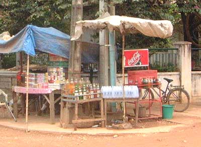 車窓から見ていて、もう一つ大発見?をしました。 右の写真を見て下さい。これ、どう見てもジュース屋さんですよね。看板もCocaCola。 こうした店を道端のいたるところで見かけました。 「暑く湿気の多い国だからくれぐれも水分の補給には気をつけて下さい」と出発前に読んだどのガイドブックにも書いてあり、わざわざ日本からペットボトル6本のウーロン茶を持参した私、「やはり暑い国だからジュースがよく売れるんだなぁ。」と勝手に納得していました。 しかし、これは大間違い。 写真の CocaCola の看板の下にある赤いケースは、何か分かりませんがジュースだと思います。その横に並んでいる白いボトルはミネラルウオーター。其の横に二段になって並んでいるのが、これがガソリンです。この店は飲料と一緒にガソリンを売っていますが、ガソリンだけを売っている店もたくさんありました。 それでは、ガソリンスタンドが無いのかと言うと、街中では日本で見かけるのと同じような真新しい立派なガソリンスタンドを数軒見かけました。