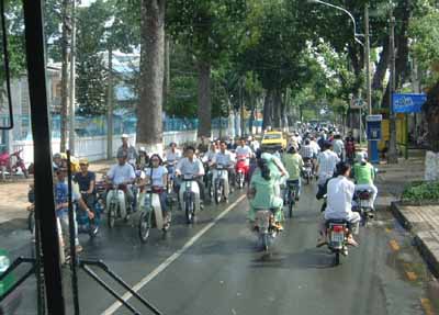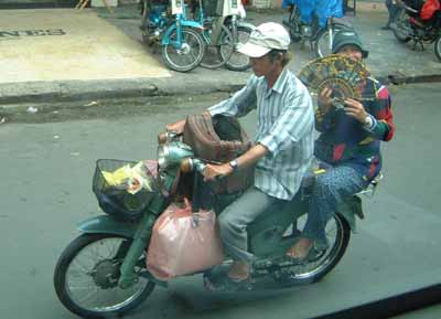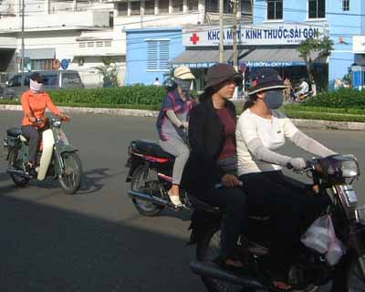 その時は、ホテルの前がメインストリートだから、通勤時間帯で混むのだろうとくらいに思っていましたが、旅を続ける間にこの街のバイクの多さに改めて驚きました。表通りだけではなく、裏通りに入ってもバイクの数は変わりません。この国の人は、全てバイクに乗って移動しているのではないかと思われるほど。事実、歩道を歩いている人はまばらで、車道を埋め尽くしたバイクが川の流れのように流れていると言った感じ。ガイドの説明では、ホーチミン市の人口は現在530万人、バイクの数は250万台とのこと。子供や年寄を除けば、殆ど全員がバイクを持っている勘定になる。 走っているバイクは殆どが HONDA や SUZUKI 等の日本ブランドを付けていますが、これは、全て Made in China のコピー商品。日本から輸入した本物は日本円換算20万円くらいしますが、中国製のコピー商品は5万円くらいで買えるとのこと。外観だけでは本物かコピーか区別がつかないほど精巧に作られていて全く分かりません。 バイクもこれだけ普及すると、それなりの文化が生まれてきて、乗り方からファッションに至るまで、眺めていても飽きることがありません。この国では4人まで乗ることが許可されているとのことで、乗り方も実に様々。 中でも、今流行のトップファッションは女性の月光仮面スタイルのようでした。深々と帽子を被り、黒のサングラスにマスク。そして、長袖の手