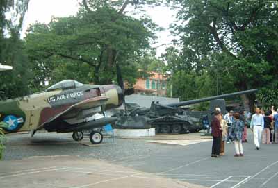 先ず最初に訪れたのは、統一会堂と呼ばれるかっての南ヴェトナム大統領官邸でした。ここの庭には、サイゴン陥落の時、大統領官邸に一番乗りした戦車が二台ヴェトナム統一のシンボルとして置かれていました。 次に訪れたのは、戦争証跡博物館でした。 ここには、ヴェトナム戦争当時米軍が使った重火器や戦車、それに飛行機などの戦利品が屋外展示され、屋内展示場には、小火器類や、米軍や南ヴェトナム軍が行った残虐行為の写真がたくさん展示されていました。ベトコンの生首を手に下げて記念写真を撮る米兵、共産ゲリラに対する拷問等、正に目を被いたくなるような写真が部屋一杯に展示されていました。 戦争は、人を狂気にすると言いますが、本当にこんな事が行われたのだろうかと、戦争の恐ろしさ悲惨さを痛感した次第です。