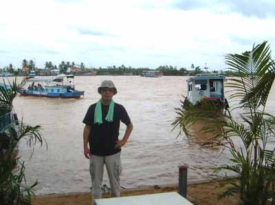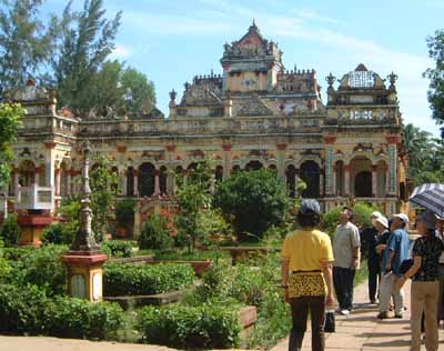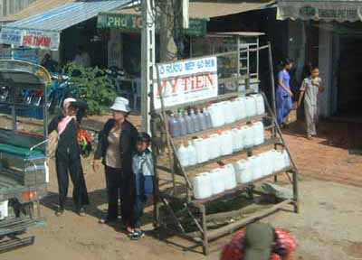 田園地帯に入った時から、私は、水田のあちこちに白いものが見えるが気になっていました。ガイドに聞くとお墓とのこと。この地域では、現在でも土葬が行われていて、ドイモイ政策(開放政策)になってからは土地の個人所有が認められたため、自分の田の中にお墓をつくているとのこと。家族を共同埋葬せず、一人に一つのお墓を作るとのことで、田の中にお墓がいっぱい散らばっています。 お米が豊富に採れるこの地域では焼酎の生産も盛んで、途中の村では、道路端でポリタンクに入れた焼酎をうっていました。写真のようなスタンドが数キロに亘って並んでいました。 メコン川クルーズのために訪れたミトー市は、現在は学都として栄えていますが、ヴェトナム戦争当時は、米軍の爆撃で徹底的に破壊されつくしたた街だそうです。このミトー市の外れにフランス植民地当時にフランスと中国の様式を取り入れて作られたヴィンチャン寺という古寺がありました。1849年建立ということですから歴史的建造物というほど古いものではありません。この寺が有名なのは、ヴェトナム戦争当時米軍に抗議 して僧侶が4人も焼身自殺をしていると言うことからでした。 やはりこの街にも、ヴェトナム戦争の記憶が一杯でした。 いよいよ今回の旅の本命メコン川クルーズです。ここを訪れる前に私が頭の中で描いていた光景は、雨季で増水したメコン川の濁流がメコンデルタの大地を覆いつくしスコールの中を濤濤と渦を巻いて流れる様でした。