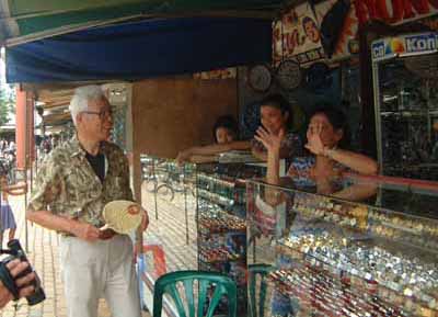 私が折角日本から持って行ったカップヌードルは1個25円、どんぶり型の中華蕎麦45円、缶ジュース類(オレンジ、レモン、コーラ、7アップ等々)25円〜40円。 こうなると、同行のご婦人連は、もう我慢できません。 買いまくりはじめました。それも調味料や日常用品をです。そして、ダンボール箱に詰めて別送。 兎に角、買物好きな人にはたまらない国です。 特に、この国では工賃が安いせいか、手芸品は安く豊富にありました。 同行のご婦人は、竹で編んだハンドバックを、日本で買えば1万円以上すると言って1000円で買っていました。 私は、こう言うものを見る目がありませんので何ともいえませんが、確かに竹の表皮を薄くして編んだ手の込んだものでした。私も、竹で編んだティッシュボックスをお土産に買いましたが、4個で5ドル。持って帰るのにかさばるのが唯一の難点。