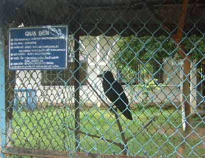 しかし、一羽だけいました。 軍が管理しているというスネークファームへ寄った時、一羽だけいました。それも金網の中に。 このスネークファームは血清研究所があったところから察するに、毒蛇に噛まれた時のための血清を作っている施設のようで、園内にいろいろな毒蛇を飼っていましたが、小さな動物園もあり珍しい動物が幾種類か飼われていました。その中にカラスがいたのです。 写真で見るように、ちゃんと説明書きもありました。 ヴェトナム語で書いてあるので何と書いてあるのか分かりませんが、私が冗談で 「この鳥は、主に日本に生息し、カーカーと鳴く」と書いてあると言うと、 ガイドが、 「ヴェトナム語ではカラスをカーと言う」との説明。 そう言えば説明書きを見てください。QUA(カー)と書いてあります。 殆どの生物は食料の量に比例して繁殖しますが、カラスもその例外ではなく、東南アジアの国々では道路端に生塵を見たことがありません。日本のように街角に一杯カラスの餌が放置されているところでは、カラスも大繁殖するのでしょう。