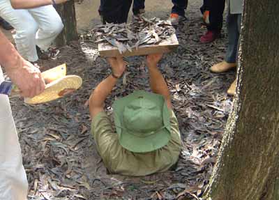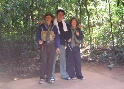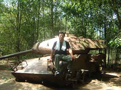 この地域には実に様々な仕掛けが作られていました。枯葉の間に張られたピアノ線に触れれば地雷が爆発したり竹槍が落ちてきたり、竹やりの一杯立てられたどんでん返しの落とし穴等々。恐怖心に駆られた南ヴェトナム側兵士は、一歩たりともこの地域に踏み込むことができなかったことでしょう。数台の戦車が危険を冒してこの地域に乗り込んだそうですが、すべで爆破されてしまったそうです。 枯葉剤によって全ての木が枯れてしまったこの地域では、今繁っている木は全て若い木ばかりでした。 この基地跡は現在も軍が管理しているのでしょうか、射撃場があり観光客にも銃を撃たせてくれる設備がありました。 クチへの途上、路端にヴェトナム国旗を掘り込んだ墓石がびっしりと建てられた墓地を数ヶ所見かけましたが、おそらくヴェトナム戦争で亡くなった兵士たちの墓ではないかと思います。
