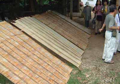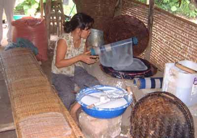 ヴェトナム料理では、生春巻が有名ですが、クチ村は、春巻用のライスペーパーが特産のようで、道路脇に延々とすのこに並べてライスペーパーが干してありました。同行の皆さんの希望もあり通りがかりの家に寄りライスペーパーを作っているところを見せてもらいました。
