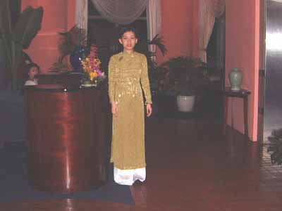 このラウンジの受付カウンターにいた若いアオザイ姿の女性に目が止まりました。知的で清楚な感じのこの女性は、私がイメージしていたアオザイ娘そのもので、早速写真を撮らせてもらいました。最初は恥ずかしがっていましたが、なんとか応じてくれポーズをとってくれました。今回の旅では、アオザイ姿の女性の写真を写す機会は全く無く、この写真が唯一のアオザイ女性の写真でした。 この国では、写真を写すという習慣はあまり無いようで、この女性からも、ぜひ写した写真を送って欲しいと住所を書いてくれました。そう言えば街中でもカメラを持った人は全く見かけませんでした。そのかわり、街の所々にはカメラを持った写真屋さんがいて、皆その写真屋に写してもらっているようでした。 時代は刻々と変化していて、一地域の風俗や習慣もどんどん変わっているのでしょう、街で見かける若い女性は、ジーパンにティシャツ姿が多かったような気がします。
