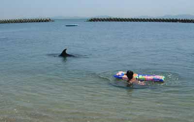 そんなことを考えている時、私の目にとんでもない情景が入って来ました。 「あっ、鮫がいる。」 海で泳いでいる子供達に向かって、鮫の鰭が水を切って近付いて来るではありませんか。 それにしても、海岸に居る人たちはいやに落ち着いている。私は急いでその人たちの所へ行き聞いて見ました。