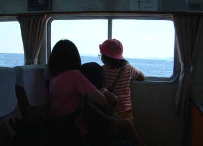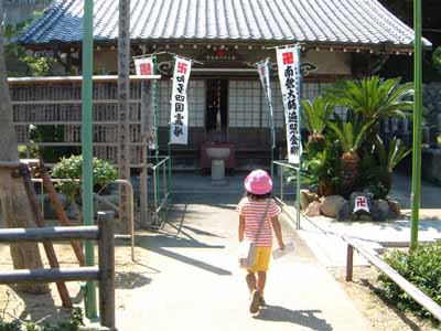 昼食も終り、いよいよ次の島篠島への船出です。高速艇の威力はすごく、船の両脇に大きな波と水しぶきを上げて高速で走る様は、初めて船に乗った孫達には大人気で「すごい、すごい」の連発で、船窓に顔をくっ付けるようにして飽くことなく眺めていました。 篠島には3つの札所があり、先ず最初に第38番正法禅寺に向かいました。篠島は日間賀島の倍ほどの広さ。港は一箇所、札所まではけっこう離れていて、きつい坂道を30分ほど歩かなければいけません。夏の盛りを過ぎた時期とは言え、午後1時、灼熱の太陽が照りつける舗装道路を滝のように流れる汗を拭き拭きの強行軍。 港から10分ほど歩いた所で、3歳の下の孫がついに歩行拒否。なだめようがすかせようが動こうとはしない。結局私が抱っこして歩く事になってしまいました。 正法禅寺は篠島港を一望できる絶景の場所にあって、海から吹き上げる清風は、汗にまみれた全身に心地よく染み渡り山頂を征服した登山家の気分でした。