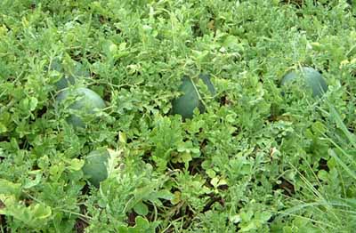 スイカは、不思議な作物で、水分を豊富に与えれば葉が大きく伸び伸びと育ちますが、水分が少ないと葉が小さく悴んだようになってしまいます。今年は、苗を植えた後雨が無くずっと日照りが続いたせいか苗の育ちが悪く、病気が出たのではと親切に教えてくれた人もいました。 でも、7月の始めころ豊富に雨が降り、スイカの蔓は元気に大きな葉をつけぐんぐん伸びてくれました。しかし、スイカは雨を嫌う作物で、雨が続くと受粉できず実もつきません。蔓だけは元気でも実がまったく付かない。近所の人たちが、今度は、肥料のやりすぎでは等と専門的な解説をしてくれました。 今年は、もう駄目とあきらめ、スイカは買ってきて食べていました。 ところが、早めの台風がいくつも通り過ぎ大雨を降らせた後、今度は雨なしの日が続きました。スイカは、遅ればせながら子孫を残すため大活躍を始めたようでした。でも、もう今年は駄目と諦めきっていた私の目に、生い茂った茂みの中に出来た小さなスイカの実が入るはずがありません。毎日続く猛暑の中でスイカは遺伝子のプログラムに従いどんどん葉を小さくして行きました。もう今年は実を付けずに枯れてしまうのかと思っていた矢先、悴んだように空き空きになった葉の間からスイカの実が見えるではありませんか。あれっと思って念入りに見回してみると、あちらにも一つ、こちらにも一つ、あるはあるは、あることが分かればもう次々と目に入ってきます。