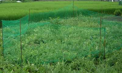 スイカは、やっぱり私を裏切らなかった。思わず顔がほころび、気分まで晴れ晴れとしてきました。 収穫の日が待ち遠しく、毎日数回畑へ通いました。 ところが、ところがである。世の中それほど甘くはありませんでした。 もう今日当たりはと思いめぼしを付けておいたスイカを採りに出かけた私の目に入ったのは、見るも無残なスイカのすがたでした。スイカの上の部分に拳ほどの穴が開けられ、中身が半分ほど食べられていました。 小さな鳥では硬いスイカの皮を食い破ることは出来ないから、おそらくいつも畑にたむろしているカラスの悪戯ではと勝手に決め、なんとかしなくてはとネットを被せてみたりいろいろ対策を考えてみました。しかし、なかなか効果が現れません。熟したころになると穴をあけられ台無しにされてしまう。 そんなある日、朝早く畑へ出かけた私の目に入ったのは、雛鳥を連れた雉の家族でした。一生懸命お食事中。おいしそうにスイカを突いていました。 これだったのか、急いでスイカの周りにネットを張りました。雉は飛ぶことは少なく、殆ど地上を走って移動します。特に子ずれの雉は、子供と一緒にいる時には先ず飛びません。ですから、歩いて入れ無くすれば先ず大丈夫です。 こんな状態で今年は私たちの口には未だ一個も入っていませんが、もう大丈夫。近々に美味しい自作のスイカを味わうことが出来ることを信じて毎日畑に通っている今日この頃です。