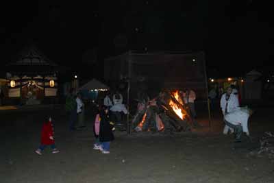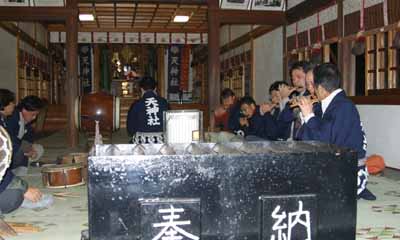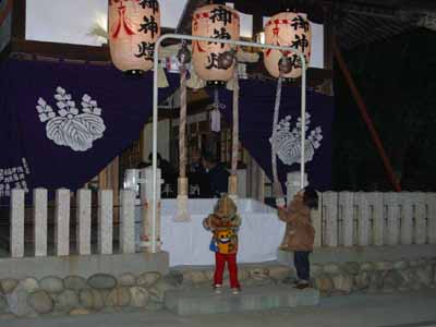 除夜祭は、大晦日の11時から始まります。神主の祝詞に始まり、お神楽が奉納されます。 このお神楽は、昔から新田町内会の若い衆によって奉納されていましたが、近年は後継者が無く、かっての若い衆も年寄りとなって年寄りによるお神楽奉納になっていましたが、今年のお神楽には若い人たちが半分ほど混じっていました。後継者の育成には苦労されたことと思います。 孫たちは、こんな夜中の外出は始めての経験。目にするもの全てが珍しく大はしゃぎ。おそらくハリーポッターの世界へ来たような気分になっていたのではないでしょうか。 天神社の境内に並んで御嶽山開山の祖覚明霊神の社があり、ここでも新年の行事が行われており、新しい年を迎える雰囲気を盛り上げていました。
