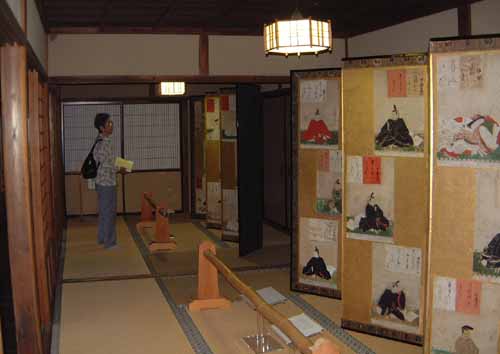 伊邪那岐伊邪那美の男女二神が祭られていることから縁結び延命長寿の神様として古くから信仰を集めているそうです。 私達が訪れた日、大社秘蔵の「三十六歌仙絵屏風」の特別公開が奥書院で行われていました。 絵屏風もさることながら、私は、池のある庭園を眺める奥書院にたいへん興味を感じました。この奥書院の庭園は、太閤秀吉の生母大政所が延命祈願のお礼に一万石を寄進した際に造られたものと伝えられており、また、この奥書院は、彦根藩主到来の折や勅使到来の折にも使われたとのことで書院の周りの廊下は鴬張りがなされていました。 家内は、御朱印帳を買い、その第一ページに多賀大社の御朱印を押してもらいました。 多賀大社の名物は、延命蕎麦、糸切餅、お強にお多賀杓子。