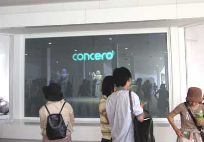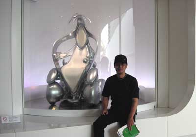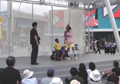東ゲートから会場に向かうと否が応でも真っ先にトヨタグループ館に突き当たる。ここは一番人気のパビリオンで、ここだけに1日を費やす覚悟が無いと入場は無理。私には、まる一日行列して待つなどと言う事は絶対に出来ない。この異常な大行列緩和策として主催者側もいろいろ入場方法を検討したようで、そのなかの一つの策として展示物を見るだけの人のために別の入場口が作られた。数日前の新聞に、展示館の中でロボットショーのダイジェストをTVで流しているので、欲を言わなきゃ見たのと同じと言うようなことが書いてあった。 どうせ、トヨタ館の前を通って行くのだから見て行こうと入館ゲートへ行くと、ショーを見る人の入場口と展示館への入場口が隣り合わせて別になっていた。展示館側は、すいすいと入ることが出来がらがら。 大型スクリーンでは、ロボットショーが上映されていた。これを見ているだけでも結構楽しい。芝居でも歌でもTVで見るより舞台を見た方がいいことは当たり前のこと。ショーに使われている未来の自動車コンセプトビークル「i-unit」の実物を見ることが出来たし、ガイドブックにトヨタ館のスタンプも押してきた。まあまあ満足。