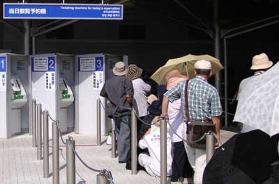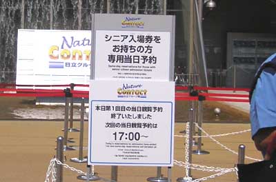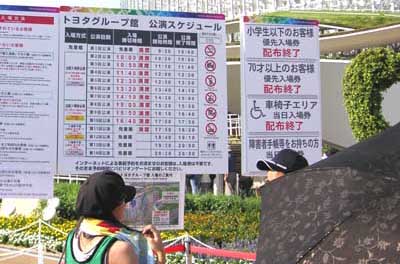 青年のアドバイスに従ってワンダーサーカス館を出ると日立グループ館へ急いだ。青年が言ったとおりまだ二時間以上前なのにシニア予約券発行機の前には長い行列ができていた。一般予約券の行列には屋根があるのにシニアや障害者は屋根無しの炎天下。