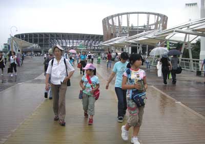 朝、時々小雨が降っていたが風は全く無く穏かなもの。孫達は、朝6時頃準備万端整え大張り切り。8時頃出ようかと決めていたが準備が出来ているのなら早い方がいい。孫達にトヨタグループ館は何が何でも見せてやりたかった。そのためには早ければそれに越したことは無い。7時に家を出、7時半のシャトルバスに乗り、8時に東ゲートの入場口に並んだ。9時開門だから一時間の待ち。やはり、台風の所為でここまでは待ったく待つことなくスムーズに来てしまった。