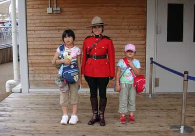 カナダ館の前で女性警備隊員と孫たち。暑いのにきちんと制服を着て、乗馬服姿が凛々しいですね。