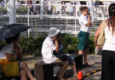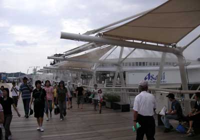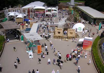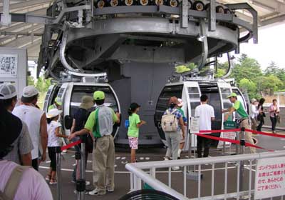 何時ものように名古屋空港駐車場からシャトルバスで会場東ゲートへ向かうコースで行きましたが、空港内の駐車場は満車で、少し離れたところにある第二駐車場に停める事になりました。こんなことは初めてで、会場の混雑が予想されました。前売券の残が300万枚ほどあるとのことですからこれからは毎日混雑が続くことと思います。 時間が時間だけにバスもゲートも全くがらがら。会場へ着いたのは1時半頃。東ゲートから歩いて会場に向かうと真っ先に目の前に現れるのは、瀬戸会場へ向かうモリゾー・ゴンドラの乗り場です。瀬戸会場は、特に私が興味を持つパビリオンも無く、今までは素通りしていましたが、どんな様子か一度くらいは見ておいた方がと思ったことと、プライバシーの保護の為、ゴンドラが民家の上を通る時には窓が瞬間に曇りガラスのように真白になり外が見えなくなるとのことなのでどのようになるのか大変興味を感じたことが理由でした。事実、下に民家がと思った瞬間にぱっと窓が白くなってしまいました。地上50メートル近くを行くゴンドラからの眺めは正に絶景なのに・・・。ヨーロッパの観光地では、観光客の通る路傍の民家には補助金を出してわざわざ家の中が見えてもいいように整備させていると言う事です。高い上空から民家の中など見ることは殆んど出来ませんでした。目隠しをしてしまうのではなくヨーロッパのようにゴンドラから回りの景色を楽しませる何かいい方法は無かったものかと思います。