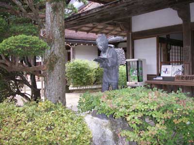 ホテルのチェックインタイムが午後3時ですので、あまり早く家を出てもということで昼少し前に家を出、蕎麦が美味しいという途中の道の駅で昼食を摂りホテルに向かいました。それでも2時頃ホテルに着いてしまいました。 時間潰しにと、国道を高山の方へ少し上った所にある名刹禅昌寺へ行くことにしました。 禅昌寺は、鎌倉幕府九代将軍、守邦親王の祈願所であったとの事で、皇室との関係も深く棟に幾つもの菊の紋章が付けてありました。境内には、遠く平安時代から世の移り変わりを見てきたであろう樹齢千二百年、樹高45メートル、周囲12メートルで国の天然記念物に指定されている老杉が鬱蒼と聳え立っており、歴史の重みを感じるお寺でした。 本堂脇に何故か二ノ宮金次郎の銅像が建っていました。太平洋戦争前の小学校には校門を入ったところに必ずと言っていいほど二宮金次郎の銅像が建っていたものでした。