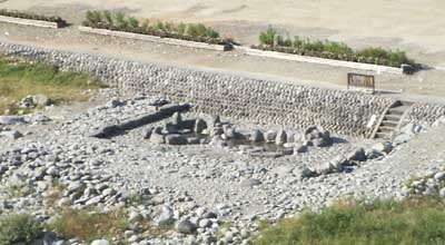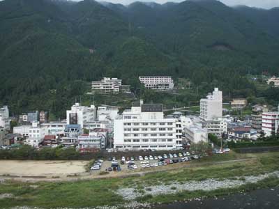 禅昌寺の門前には、石器時代の遺跡や立派な禅昌寺歴史資料館があり、禅昌寺に伝わる寺宝等を常時見ることが出来るようになっています。 1時間ほど禅昌寺で時間を潰し、3時少し過ぎに小川屋へチェックイン。部屋は、本館8階の川沿いでこのホテルの中では一番眺めのいい部屋でした。 窓を開けると川の向こうに山並みが連なり、山々の懐に抱き込まれるように下呂の街並みが広がっていました。眼前には下呂温泉病院が見え、下の川原には、雑誌などでよく紹介されている野天風呂がありました。ここに載せた写真は、早朝に写したので入浴している人がいませんが、昼間は、結構賑わっていました。流石若い女性は居ませんでしたが男性や子供を中心にした家族連れに人気があるようです。 私がこの温泉で最後に泊まったのはもう30年以上前、