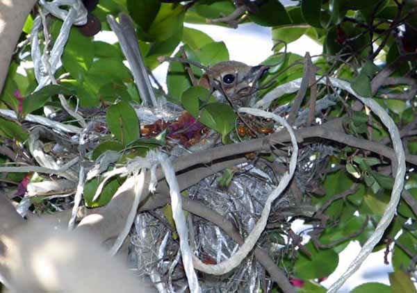 皆さん、その後お元気ですか。今年は、何時までも寒かったですね。3月の中頃になっても雪がちらつき少し異常な気がします。それでも、ここ数日暖かくなり桜の花もちらほら咲き始めました。 ![]() 「椿の木に小鳥が巣を掛けているよ。」 と家内が言うので、また鳩かと思ったのですが 「可愛い顔をした小さい鳥だよ。」 と言う。 早速見に行くと、椿の枝に作った巣からあどけない目をした小鳥か顔を出していました。百舌が卵を温めているところでした。 我家の庭に百舌が巣を作ったのは初めてのことです。異常気象の所為でしょうか。それにしても、百舌の巣を見てください。殆んどナイロンの紐で出来ています。長い紐から短い紐、太い紐から細い紐、古くなって綿のようになった紐、よく集めてきたものだと感心しました。カラスがハンガーを集めてきて巣を作るのはよく知られていますが、百舌も時代の流れに沿って最新の素材で巣を作っていました。 百舌の巣を観察していて、新しい発見をしました。我家の庭で巣を作る鳥達の殆んどは、卵を温めている雌が時々巣を離れて餌を食べに行くようですが、百舌は、卵を温めている雌に雄が餌を運んできては食べさせていました。百舌も番で子育てをするようです。雄が雌に餌を運んできたところを写真にと思っていますがなかなかうまくゆきません。 当分の間は、百舌の観察で退屈せずにすみそうです。