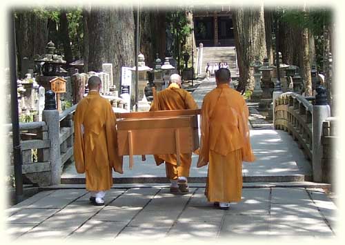 2キロ近く続くこの古い参道には、千数百年前からの名立たる武将や大名の墓碑供養塔がびっしりと立ち並び、その数20万とも言われています。新しい参道は、古い参道と全く様相が異なり、殆んどが大企業名をでかでかと書いたかくかくしかじの追悼碑だとか供養塔や記念碑ばかり、正に大きな石の看板がずらりと並んでいると言った感じで、私にとってはあまりいい印象ではありませんでした。また、古い参道が古木の生い茂る中に苔生す石塔が立ち並び荘厳な雰囲気を醸し出しているのに比べ、新しい参道は、立ち木も無く炎天下に立ち並ぶ石のモニュメントと言った感じで宗教的雰囲気はあまり無く、何故か白々しく感じるほどでした。こうした広告塔のような企業の碑を古い参道に混在させず新しい参道として切り離して造ったことは実に賢明な策であったのではないでしょうか。 御廟橋でめずらしい行事を見ることが出来ました。丁度弘法大師の昼の生身供(食事)が運ばれるところでした。御廟に供えられる生身供は、御供所で日々調理され嘗試(あじみ)地蔵を経て御廟へとはこばれます。