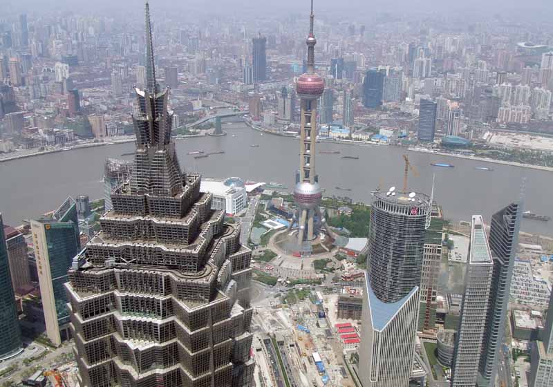 上海世界金融センターの展望台から見た景色。かってはアジア一の高さを誇った東方明珠塔が下に見える。