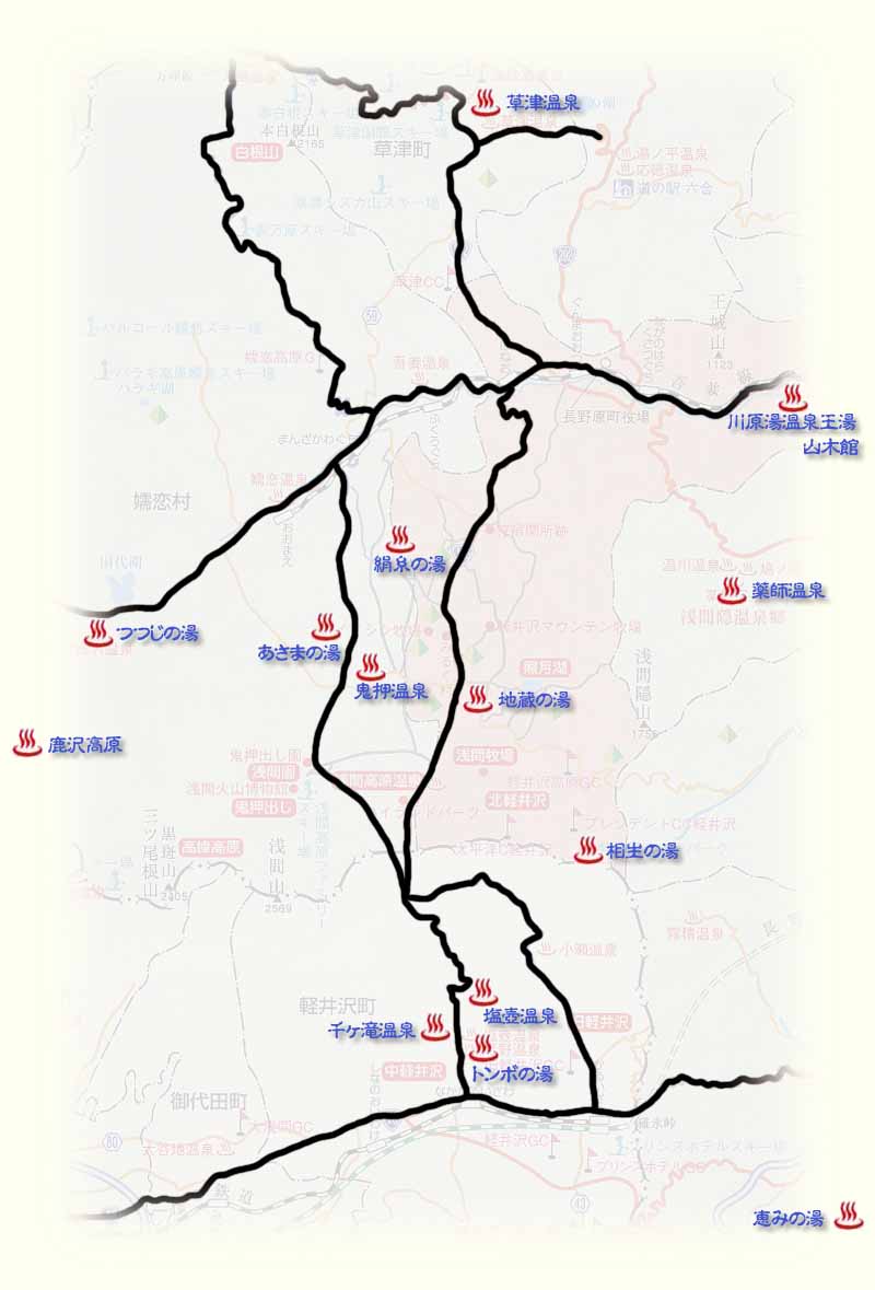 この「北軽井沢立ち寄り温泉マップ」は私が訪れた外来入浴のできる温泉の地図です。今後も新しく訪れた温泉は全て追加してゆく予定です。それぞれの温泉の詳細が分かるよう各説明ページにオフシャルサイトのある温泉についてはオフィシャルサイトを、オフシャルサイトのない温泉については、適切な一般サイトをリンクしておきました。