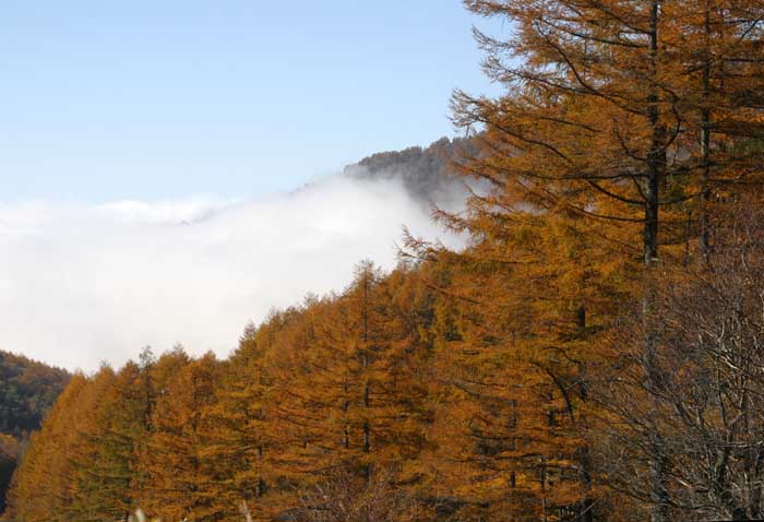 湯の丸高原から小諸側を望む。標高1,732mのこの辺りでは唐松は完全に色付いている。気温の関係か色があまりよくない。