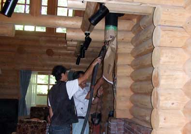 当日、午前10時頃長野総商の方が二人で来訪、早速掃除が始まりました。先ず、ストーブの上の曲がったところを取り外し、煙突の下から中を覗き汚れ具合を点検、