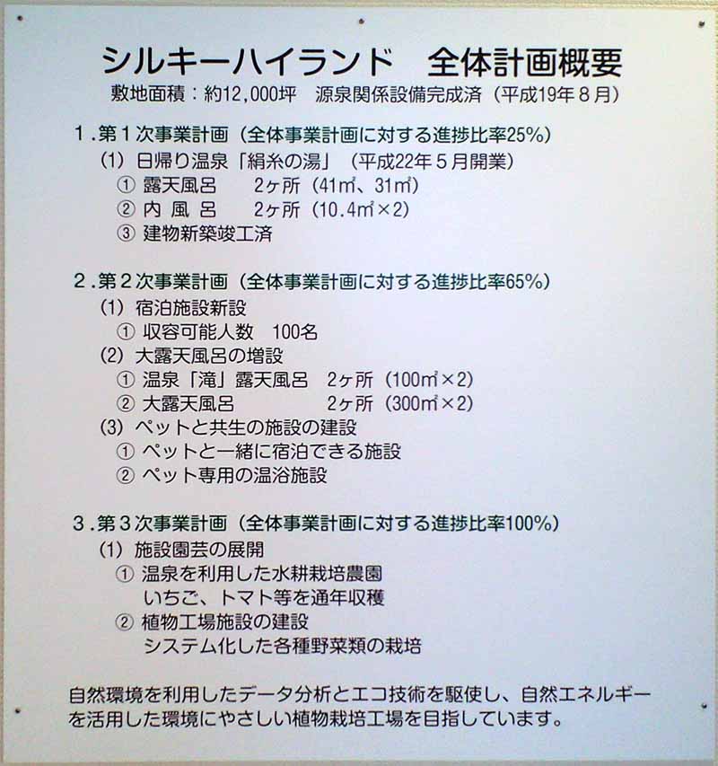 平成22年5月1日、北軽井沢に本格的なかけ流し日帰り温泉「絹糸の湯」がオープンしました。丁度連休を北軽井沢で過ごしていた温泉大好きの私は、早速訪れてみました。5月1日から5日までは、状況把握のためのテスト営業とのことで、未だ未完成の所も有りましたが北軽井沢一の広さを誇る露天風呂には十分満足。12000坪と言う広大なホテルの跡地を再開発し「北軽井沢シルキーハイランド」が造られる予定で、「絹糸の湯」は、その第1期工事。第2期工事では、現在の露天風呂の7倍強に当たる300平米の露天風呂が計画されているとのこと。北軽井沢がますます楽しくなってきました。