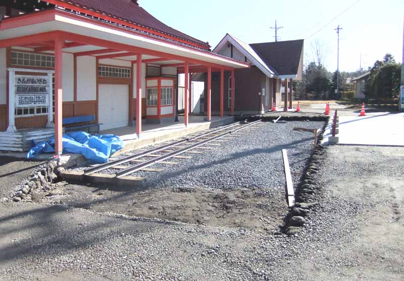 草軽電気鉄道の北軽井沢駅舎横にあった北軽井沢観光協会の建物が取り壊され、その跡地で工事が始まったのが平成21年の夏頃のことでした。観光協会の建物を立て直すのだろうくらいに思っていましたが秋も終りに近づいた頃その全容が姿を現し始めました。駅舎の横にプラットホームが作られレールが敷設されていました。北軽井沢駅の昔の姿を復元しようということのようでした。