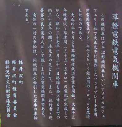 北軽井沢駅に停車中の機関車は、木製のレプリカですが、本物のデキ12型は、軽井沢駅の前に展示されています。軽井沢駅が改築されるに当たって旧駅舎は、新駅舎の隣に移築されその前庭に草軽電鉄のデキ12型が展示されています。