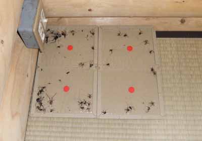 カマドウマ退治にネズミ捕りシートを使うようになってからは100パーセントと言ってもいいほどカマドウマを退治できるようになりました。上の写真は、気温も下がり始めた晩秋の頃のものでカマドウマの数も大分減っていますが、夏の最盛期には、数週間でこのシート全面が真っ黒に埋まってしまうほど捕まります。カマドウマの跳躍力は素晴らしく兎に角ぴょんぴょんと飛び回り、その行動範囲は家中なのでしょう。要所要所に捕獲シートを置いておけばシートに捕まるのは時間の問題。数週間家を空けて帰って来ても飛び回っているカマドウマは一匹も居らず実に爽やかな気分です。私は、一箱10枚入りの業務用ネズミ捕りシートを数箱ずつ買ってきます。そして、家を空ける時には、シートを要所要所に仕掛けておきます。注意しなければいけないのは、人間がかかってしまうといけません。兎に角、強力な接着力ですから、この上に乗ってしまったり、物を落としたりしたら、くっ付いた物は諦めるより仕方ないでしょう。間違って、シートの上に手でもついてしまったら正に悲劇。家に居る時はシートを片付けておきましょう。