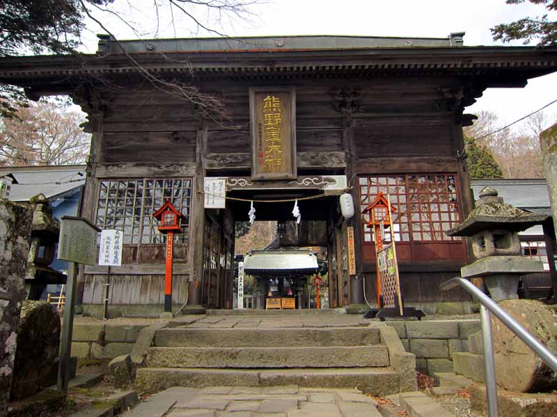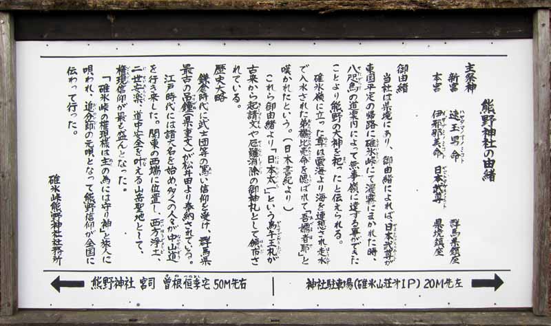 この熊野神社は、まことに珍しい神社で、参道の入り口から拝殿までそのど真ん中を縦割りに県境が走っています。向かって左が長野県、右が群馬県で、参道、鳥居、門、拝殿、すべてが一体でその真ん中を県境が走っており、何気なく歩いていれば普通の神社と全く変わるところはありません。ところが、参拝のために拝殿の前に立つとどこか普通の神社と違うことに気付きます。拝殿の真正面には鈴も賽銭箱もありません。鈴も賽銭箱も県境を挟んで左右に一つずつ置かれているのです。一見、鈴も賽銭箱も二つずつ置かれているように見えますが、そうではないようです。下の地図と由緒書きを見るとよく分かりますが、実は、長野県側と群馬県側のそれぞれに別の神社があり祀られているご神体も全く違うのでした。長野県側には、熊野皇大神社があり、群馬県側には熊野神社があります。