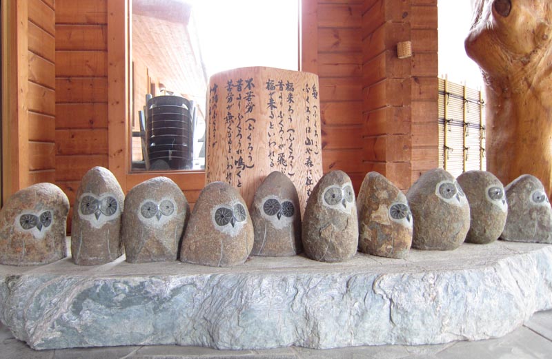 正面玄関入り口前には石の梟10羽がお出迎え。