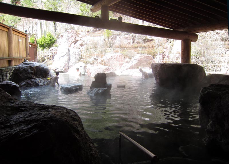 上田菅平インターで自動車道を出て、嬬恋に向かって少し走ると真田中学校近くの路傍に立っている「十福温泉」の大きな看板が目に飛び込んできます。この道を通るようになってからずっと気になっていた温泉の一つです。奥軽井沢の山荘からは少し距離がありますが、信州一の広さを誇る露天風呂のキャッチフレーズに引かれて出かけることにしました。上田市真田町から長野市に抜ける真田長野街道のほぼ中間点新地蔵峠に地蔵温泉十福の湯はありました。