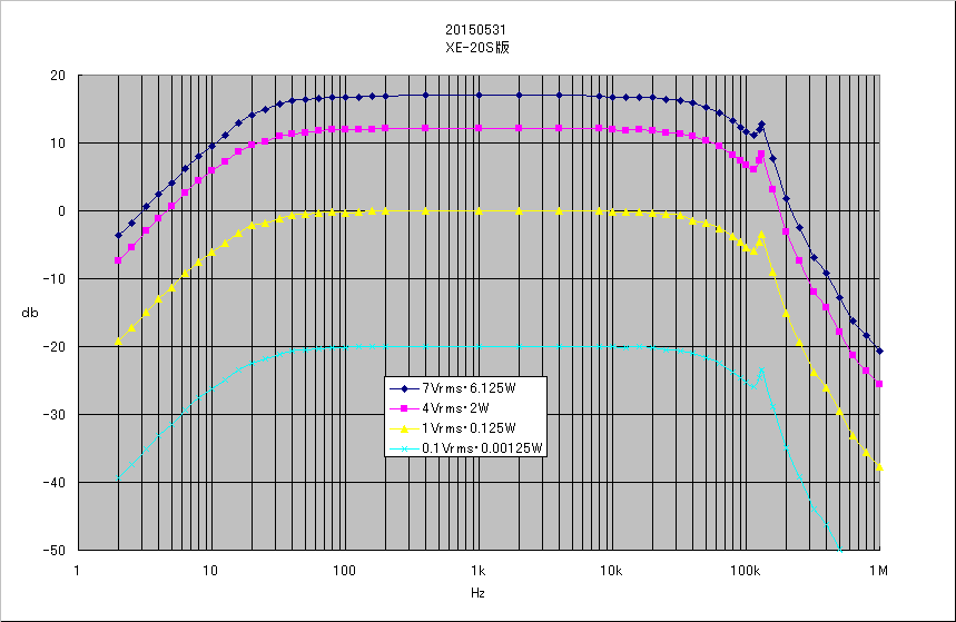 高域-3db落ちは800kHz以上でした。他の按配からは無視していい数値と存じます。なお、入力側はFG-274の50Ω送りなので、現実的ではありません。初段の出力Zは○○KΩ台だろうと思うとど~なるのか、机上計算できるはずだがしてません。