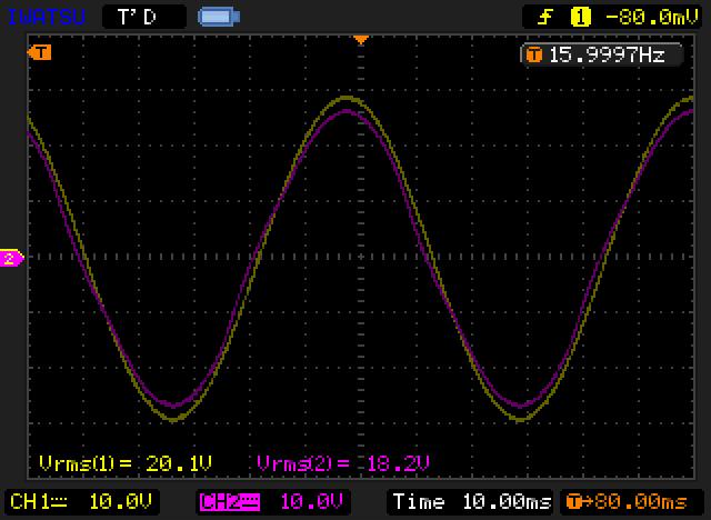 なお帯域端の尻切れは、445冶具の能力によるもので、低域はコアの励磁電流歪みに耐え切れません。高域はOPアンプのスルーレイト制限です。中域では80Vrms得られても、マトモに正弦波形を維持できたのは40Hzまでで、レスポンス低下は少ない32Hzでも“ゆがみ”が見えはぢめます。