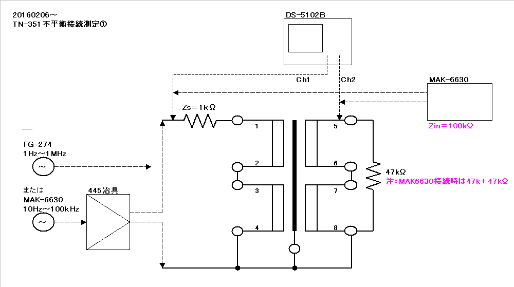オーディオアナライザ・MAK-6630のOSC出力を、直接TN...1次に注入する乱暴な測定です。OSC部の出力インピーダンスは600Ω(と書いてある)なので、Zs=470Ωに変更しました。