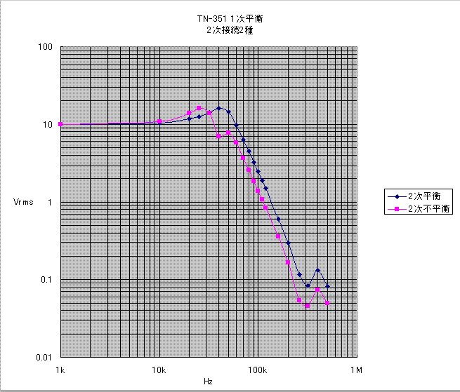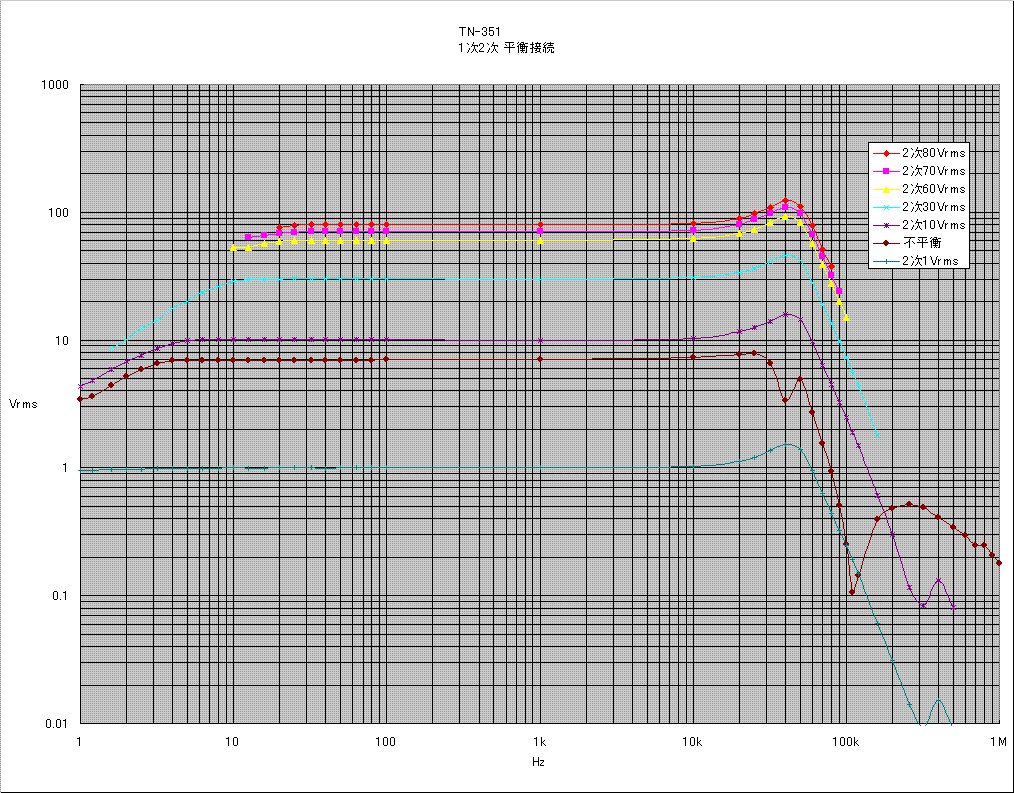 2次のみ不平衡接続(G接地)に戻して、平衡接続F特の10Vrmsと重ねてみました。縦db目盛りをさぼった手抜きデータです。