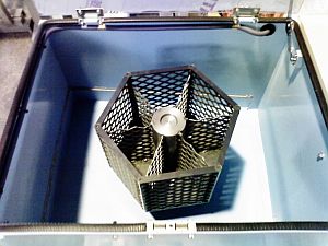 装置概要自動車用シートレールの溶接ピンを脱脂後、脱水する装置です。脱水カゴを回転させ遠心力で脱水します。スタート後脱水が完了すると自動停止します。運転中に非常停止ボタンが押されるか上面カバーが開くと回制ブレーキにより緊急停止します。それ以外にもワークをご指定いただければお客様のニーズに合わせたものを製作いたします。 次の製品へ