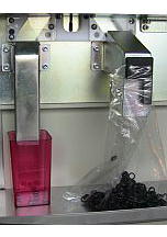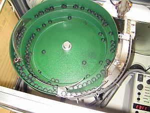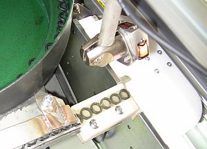 装置概要 ゴム部品を自動で外形および芯金の有無を検査しOK品とNG品の選別を行い数量をカウントする装置です。 パーツフィーダーから供給される部品をレーザーセンサで形状検査し近接センサで部品内部の芯金の有無を調べます。 選別ワイパでOK品は右側にNG品は左側に振り分けます。 タッチパネルで設定した数量に達すると自動停止しアラームでお知らせします。 この装置のタクトタイムは1個当たり0.5秒です。 ワークの搬送にはIAI社製ロボシリンダを使用しています。