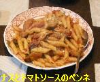 レンコンと里芋の胡麻味噌和え、塩豚のソテーになすとトマトソースのペンネ(マカロニ)を