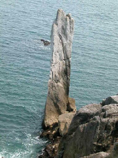 本日5月10日は間違いなく開花の季節なのに。 この地方、この季節は八重桜ボタン桜など派手な色合いの各種のサクラが非常に目 立つ。 さて、三陸とか陸中海岸とか言われる、入り組んだリアス海岸の旅はここ気仙沼大島から始まる。 ![]() 折石「巨釜」にある16メートルの岩柱 こんなに大きく長い岩柱も断崖の上から見下ろすので実際は小さく感じる 断崖絶壁が続く入り組んだ海岸美
