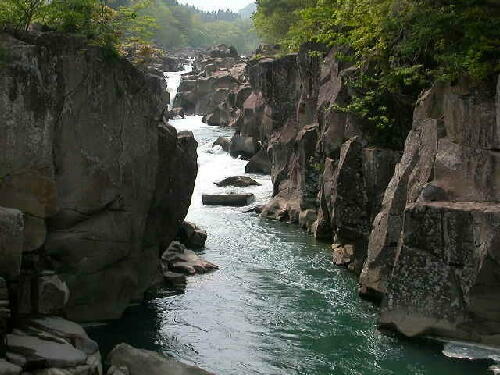 PR的な存在なのだろう、多分採算は度外視していると私は思う、入 場料が五百円というのも他のこの種の観光施設と比較すればかな り安い。 三菱財閥の発祥と深い関係にあるようだ。 ![]() 厳美渓。木曽川の上流にある「寝覚めの床」に似ている ほとんど平原台地に地割れのような感じで続いている。 高原台地に割れ目のような渓谷。 厳美渓。一関近くにある長さおよそ2キロに及ぶ渓谷だ。
